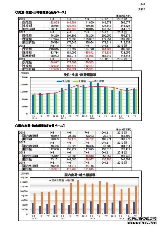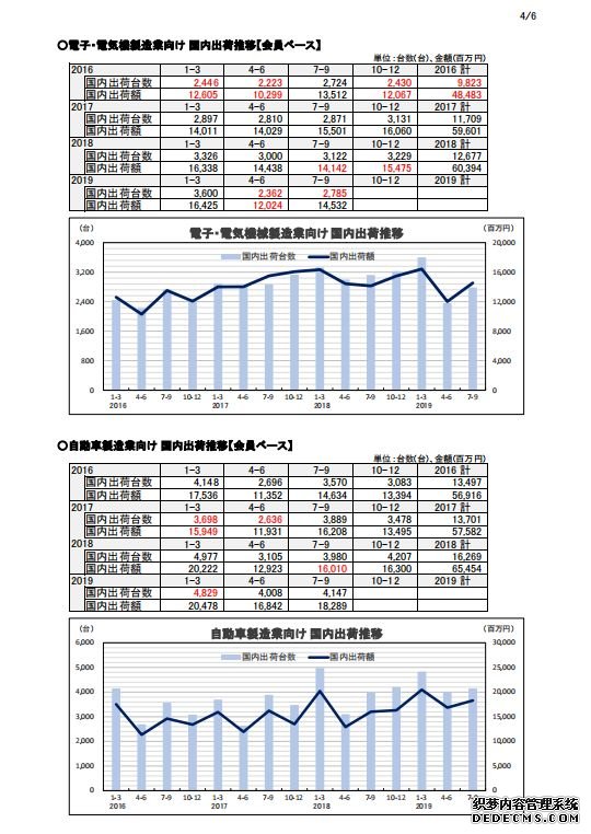 在2019年7月至9月期间,实际产量45148台,按年下降15.0%,订单金额1724亿日元,下降7.2%。整体产量同比下降7.7%,产值下降7.2%。从去年下半年开始的减速虽然有所延长,但一直保持稳定,但仍然没有任何回升的迹象。