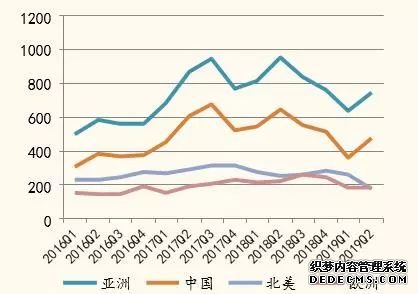 在2019年第二季度,数据显示,日本工业机器人订单量 46395 台,同比下降23.4%;订单额1775.49 亿日元,同比下降16.5%;产值 1533.75 亿日元,同比下降16.7%;产量 41945 台,同比下降 26.6%;销量 42519 台,同比下降25.15%;销售额 1578.18 亿日元,同比下降16.1%。日本对出口方面,数据显示,2019年二季度,日本对亚洲、中国、北美、欧洲出口工业机器人金额分别为 744.48、476.13 、179.41 、190.03 亿日元,分别同比下降22.11%、26.07%、29.26%、15.03%。