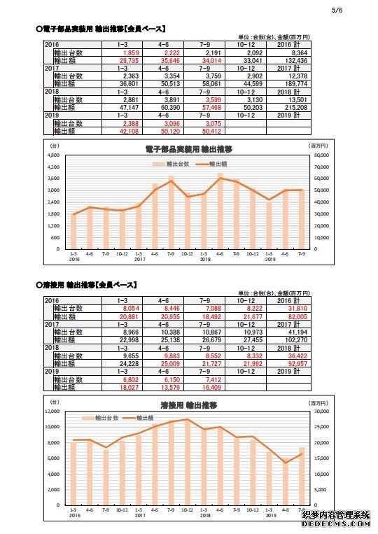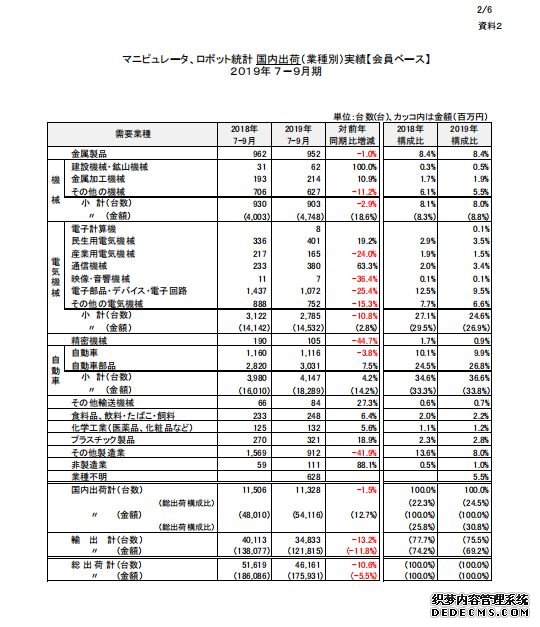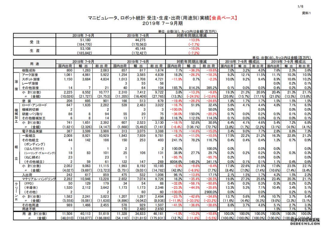 在2019年7月至9月期间,实际产量45148台,按年下降15.0%,订单金额1724亿日元,下降7.2%。整体产量同比下降7.7%,产值下降7.2%。从去年下半年开始的减速虽然有所延长,但一直保持稳定,但仍然没有任何回升的迹象。