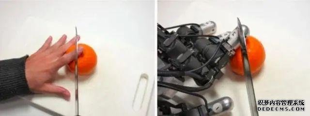 ▲研究人员发现,人们看这两张图片,同样会对刀切割机器人的手表现出共情神经反应