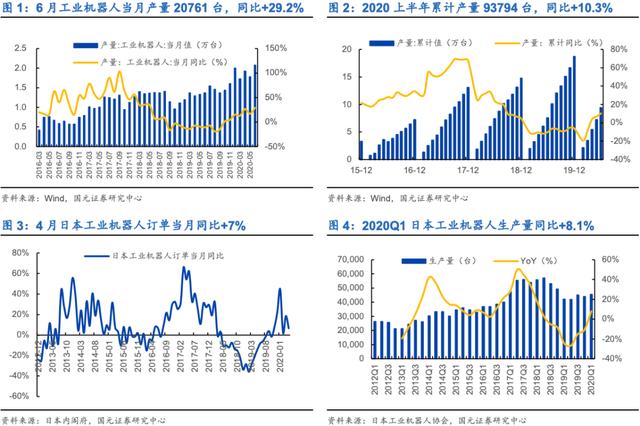 我国工业机器人行业从19年四季度起逐渐复苏,10月份起我国工业机器人产量增速转正、且增速逐月增大。20年Q1工业机器人产量虽受疫情有所影响,但二季度开始仍延续复苏趋势,且复苏强劲。另外日本工业机器人订单从19年3月起降幅缩窄、11月起增速转正,日本订单一般领先国内产量6月左右;且20Q1日本机器人产量同比+8.1%,实现七个季度以来首次增长,这也侧面佐证了我国机器人行业复苏趋势。