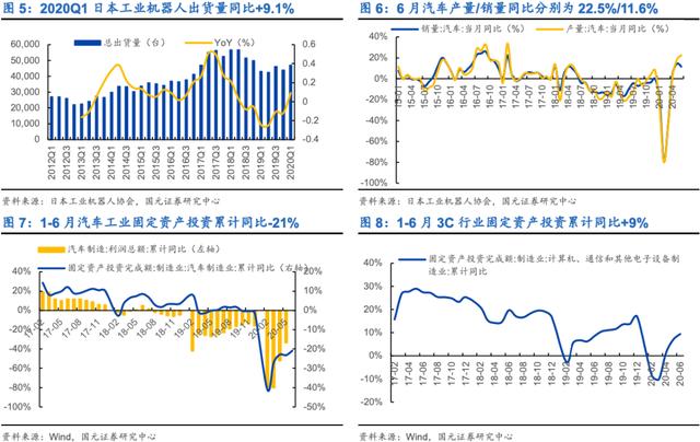4月汽车产销量增速均实现近两年来首次转正,且6月产量同比+22.5%,产销量已实现连续一季度正增长。1-6月汽车固定资产投资累计同比-20.9%,降幅持续收窄,随着车市逐渐复苏,汽车固定资产投资有望触底回升。国内5G建设全面推进,3C固定资产投资累计增速自19年初复苏,19年已达16.8%,20年4月起恢复正增长、有望延续疫情前的高速上行。且疫情期间,自动化程度较高的企业在复工复产方面的进度明显快于劳动力密集型的企业。因此,我们判断在疫情得到控制后,企业增加购置自动化设备来替代人工需求强烈。
